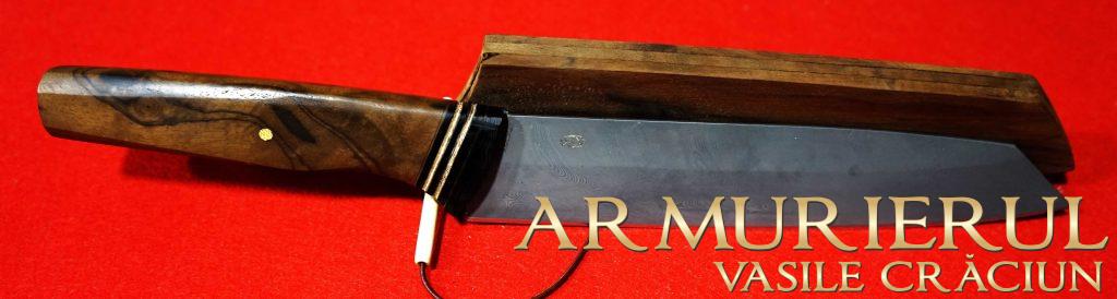 Cutit cheff bucatar CRV,otel Damasteel DS93x, duritate 64 HRc ,intretinerea pe piele pentru o perioada lunga de timp ,nu necesita ascutire .